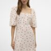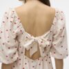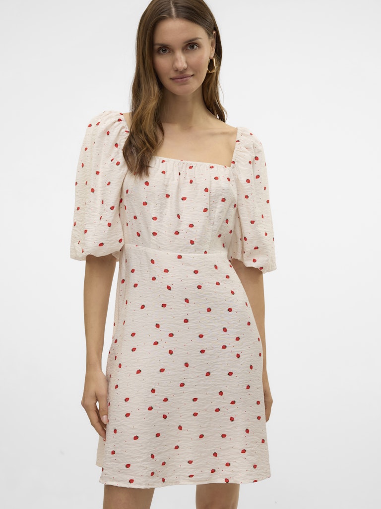 Mini φόρεμα με balloon μανίκι μέχρι τον αγκώνα.Καρέ άνοιγμα μπροστά.Ανοιχτό στην πλάτη με δέσιμο.Ανάλαφρο και δροσερό ύφασμα.Κανονική εφαρμογή.
