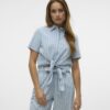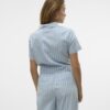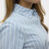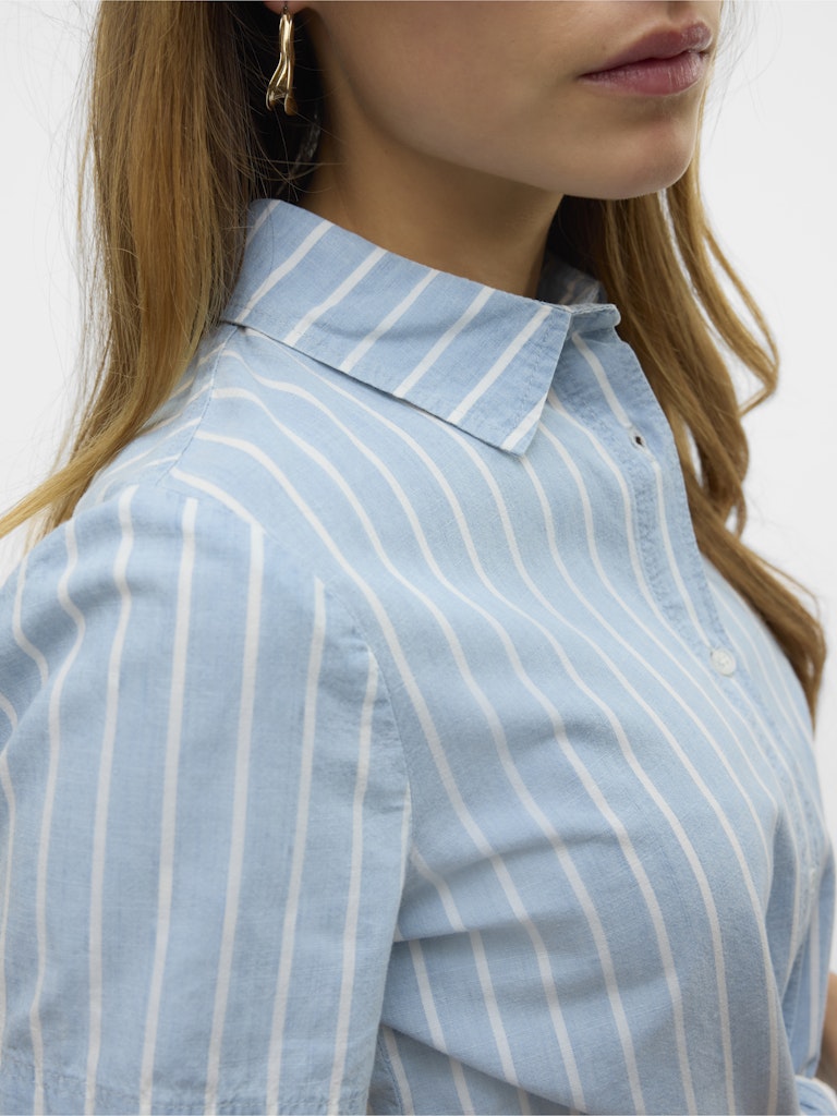 Ριγέ denim πουκάμισο με γιακά.Κοντό μα΄νικι.Κλείσιμο μπροστά με κουμπιά και δέσιμο.Boxy fit.