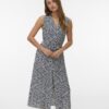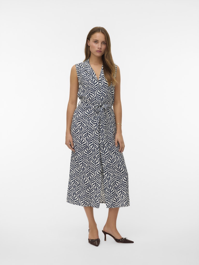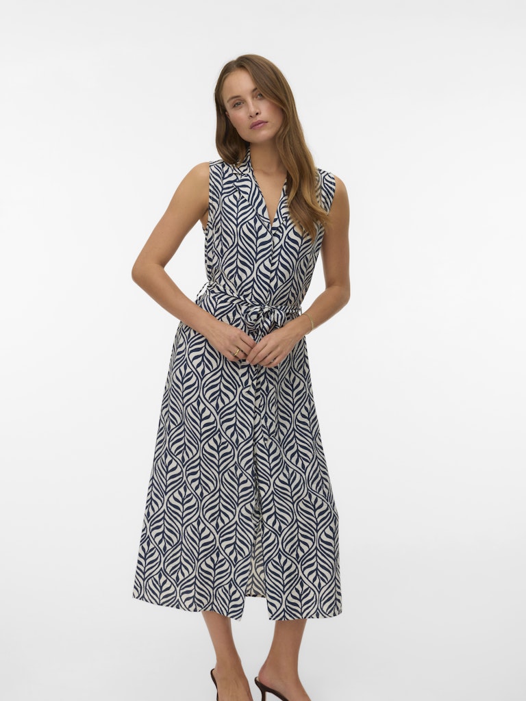 Εμπριμέ midi φόρεμα με γιακά.Αμάνικο.Κλείσιμο μπροστά με κουμπιά.Ζώνη στην μέση από το ίδιο ύφασμα.Ανάλαφρο viscose ύφασμα.Κανονική εφαρμογή.