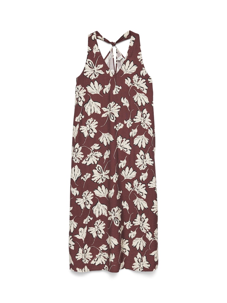 Εμπριμέ αμάνικο φόρεμα σε φαρδιά ίσια γραμμή.Λαιμόκοψη σε σχήμα V. Σχέδιο με κόμπο πίσω.Μήκος αστραγάλου.Ανάλαφρο viscose ύφασμα.Άνετη γραμμή.