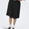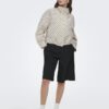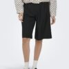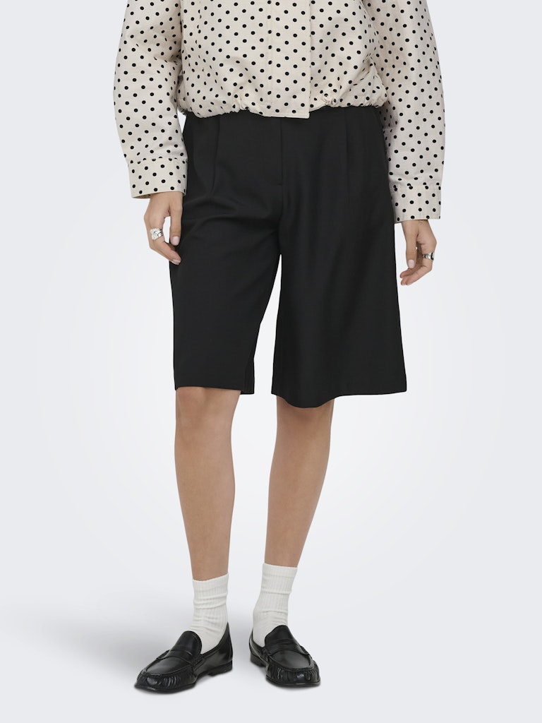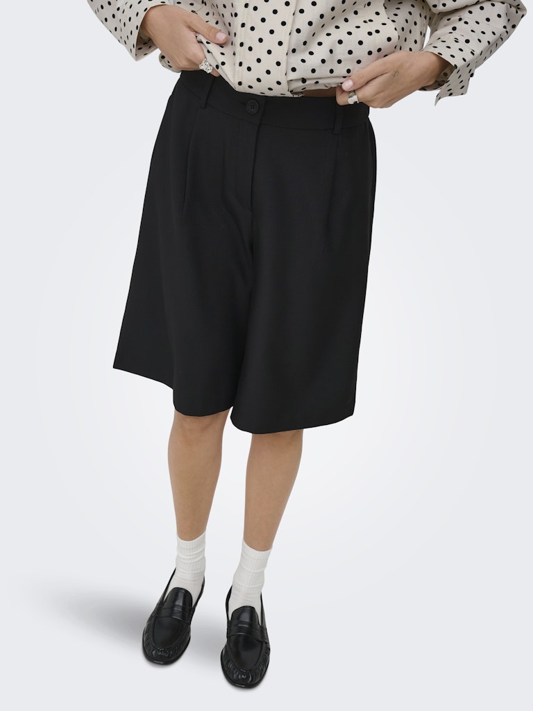 Ψηλόμεση βερμούδα με λάστιχο στο πλάι.Κλείσιμο μπροστά με φερμουάρ και κουμπί.Ελαστικό viscose ύφασμα.Μήκος στο γόνατο.Κανονική εφαρμογή.
