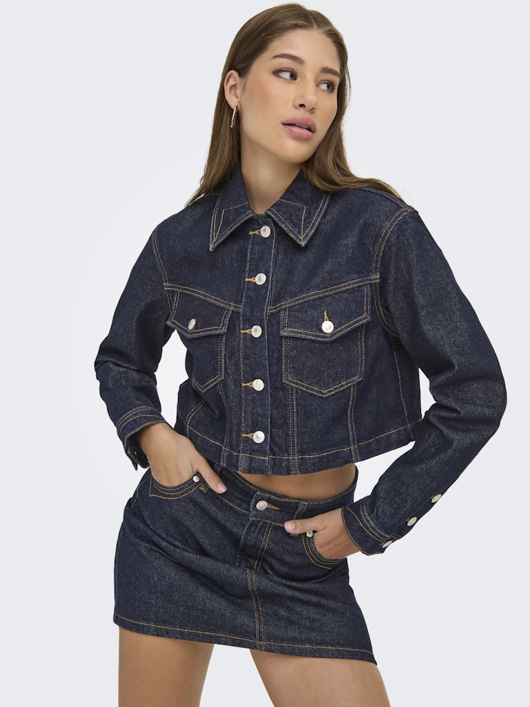 Cropped denim jacket με γιακά.Κλείσιμο μπροστά με κουμπιά.Μακρύ μανίκι με μανσέτα.Τσέπες με καπάκι μπροστά στο στήθος.Κανονική εφαρμογή.