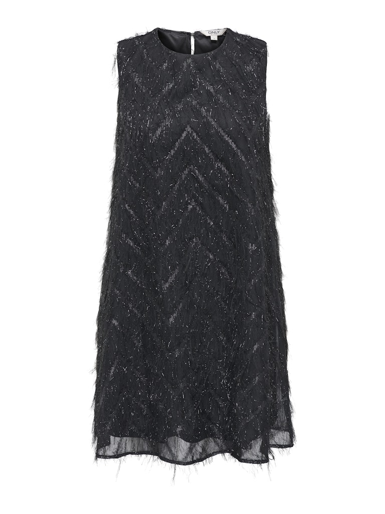 Mini φόρεμα με στρογγυλή λαιμόκοψη.Αμάνικο.Σχέδιο  με πούπουλα.Φόδρα εσωτερικά.Μήκος πάνω από το γόνατο.Κανονική εφαρμογή.