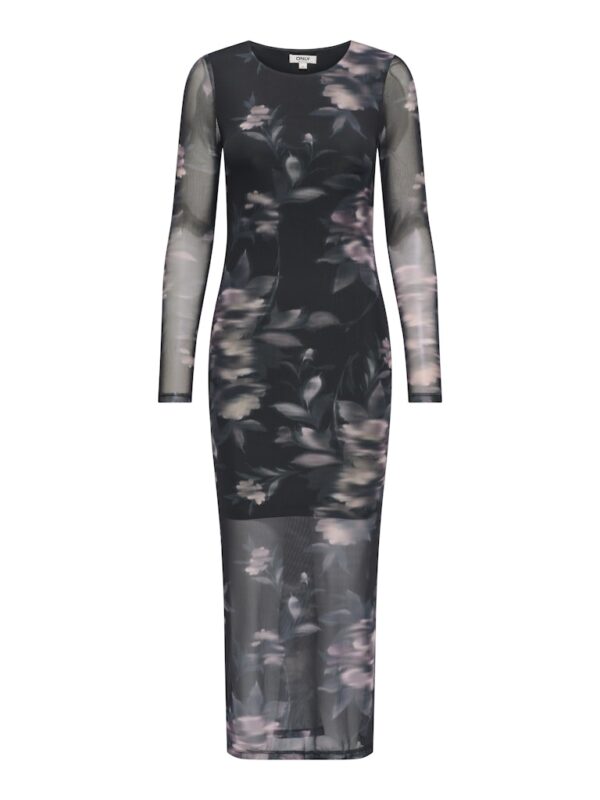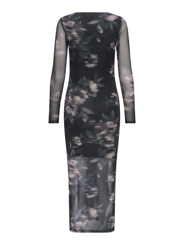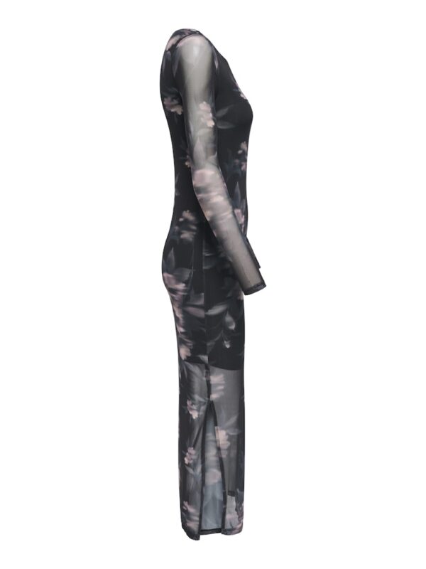 Midi floral φόρεμα με στρογγυλή λαιμόκοψη.Μακρύ μανίκι διαφάνεια.Κοντή εσωτερική φόδρα.Άνοιγμα στο πλάι.Εφαρμοστή γραμμή.