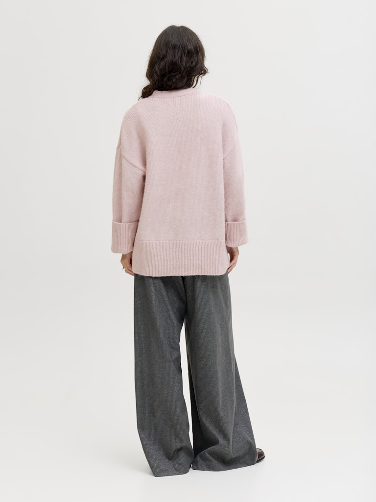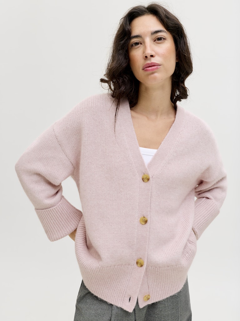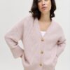 Πλεκτή ζακέτα με V λαιμόκοψη.Μακρύ μανίκι.Κλείσιμο μπροστά με κουμπιά.Μαλακή και απαλή υφή.Oversize γραμμή.