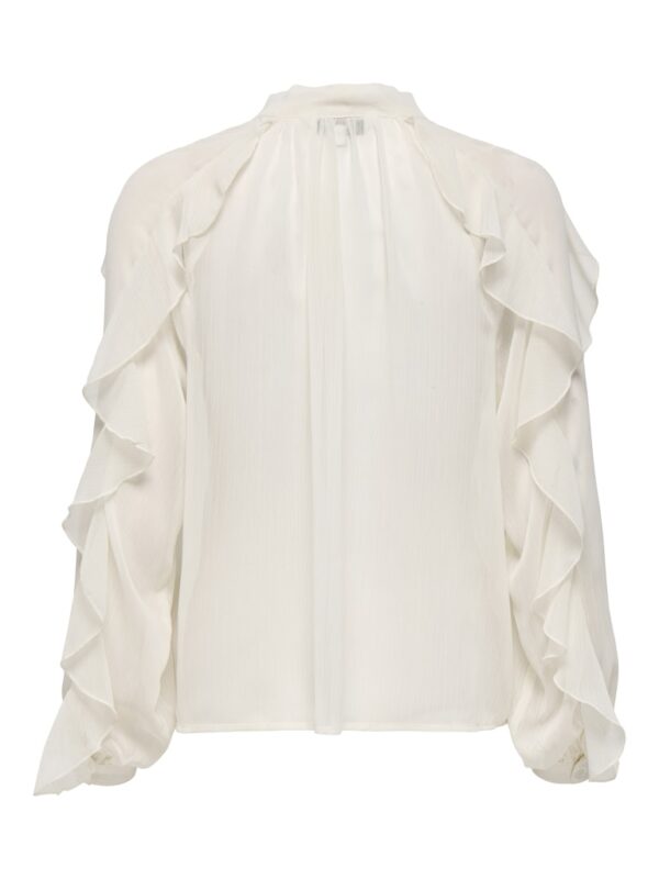 Πουκάμισο με δέσιμο φιόγκο στον λαιμό.Μακρύ μανίκι με βολάν.Διαφανές chiffon ύφασμα.Κλείσιμο μπροστά με κουμπιά.Λεπτομέρεια βολάν και μπροστά.Κανονική εφαρμογή.