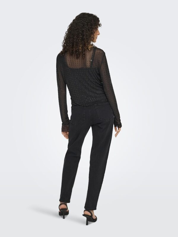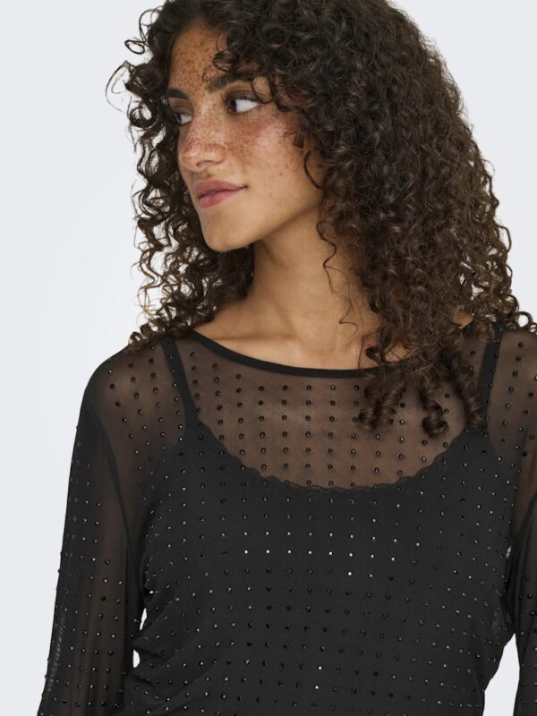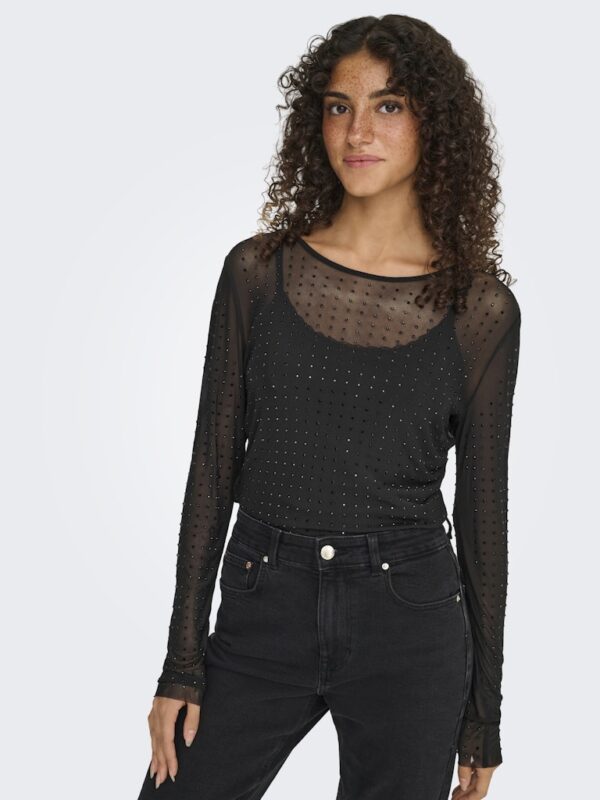 Εφαρμοστό top με διαφάνεια.Στρογγυλή λαιμόκοψη.Στρας στο ίδιο χρώμα.Μακρύ εφαρμοστό μανίκι.Κανονική εφαρμογή.