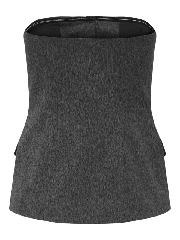 Strapless γιλέκο κοστουμιού.Κλείσιμο μπροστά με κουμπιά.Σιλικόνη εσωτερικά περιμετρικά για σταθερότητα.Τσέπες μπροστά με καπάκι.Φόδρα εσωτερικά.Εφαρμοστή γραμμή.