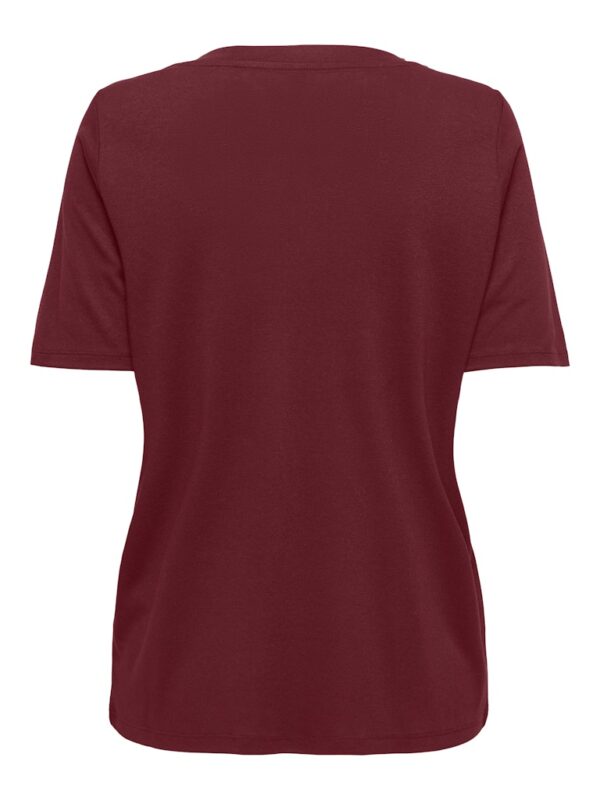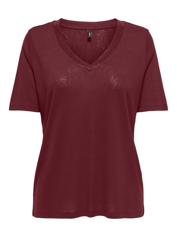 Μονόχρωμο top με κοντό μανίκι.V  λαιμόκοψη διακοσμημένη με στρας στο ίδιο χρώμα.Ανάλαφρο viscose ύφασμα.Κανονική εφαρμογή.